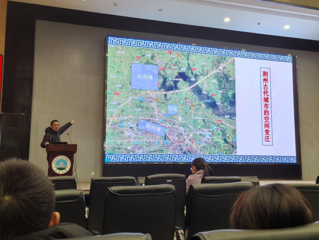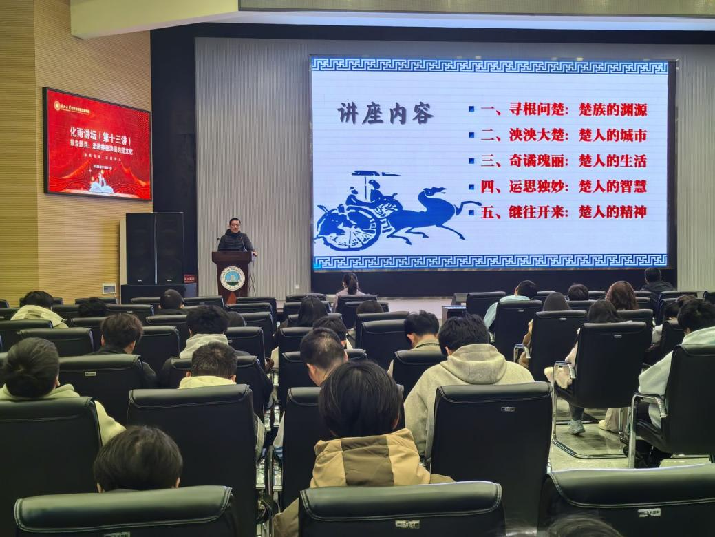 (通讯员 刘晓芳)2025年11月21日下午,化学与环境工程学院在西校区农科大楼1058报告厅举办化雨讲坛第十三讲——“走进神秘浪漫的楚文化”专题讲座。本次讲座特邀人文与新媒体学院历史系主任、荆楚文化研究中心副主任卢川老师主讲。学院党委副书记杨会军、辅导员徐茵及2025级全体学生共同参与。