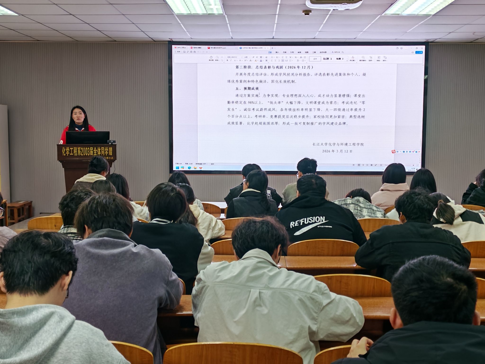 大会伊始,王娜老师围绕学院2026年学风建设专项行动工作方案,对学风建设作出系统部署,明确各个年级差异化建设重点,聚焦课堂规范、考风考纪等关键环节破解学业突出问题。其中,2024级以“转型·拓展”为核心,抓实课堂纪律、学业帮扶和科研竞赛;2023级以“选择·提升”为重点,推进考研备战、就业赋能和诚信教育。同时,会议强调,全体学生干部作为学风建设的组织者、推动者、示范者,需履行履职承诺、主动履职尽责、密切联系同学,带动班级形成比学赶超、互帮互助的良好氛围。