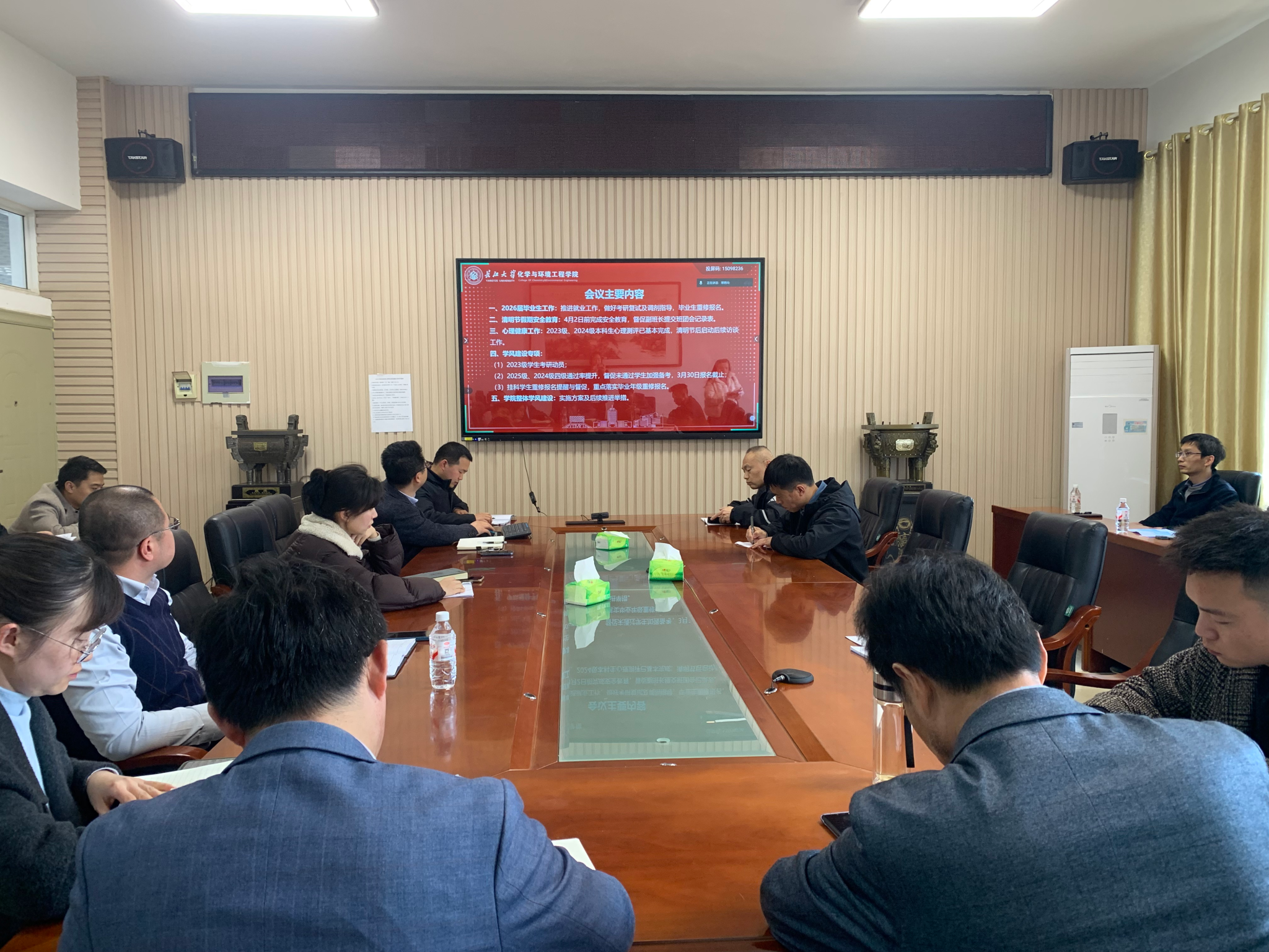 针对毕业生工作,会议明确要持续推进就业指导服务,做好考研复试及调剂指导工作,同时提醒班主任督促毕业生按时完成重修报名,确保学生顺利毕业。心理健康工作方面,2023级、2024级本科生心理测评已基本完成,清明节后将启动后续访谈工作,会议要求班主任密切关注学生心理状态,及时与学生开展谈心谈话,筑牢心理安全防线。会上,杨会军介绍了学风建设年专项行动实施方案及后续推进举措。并强调学风建设是学院人才培养的基础工程,各班主任要以高度的责任感落实各项要求,坚持分类指导、精准施策,通过课堂纪律严抓、学业帮扶实抓、考研就业同抓,推动形成比学赶超的良好氛围。