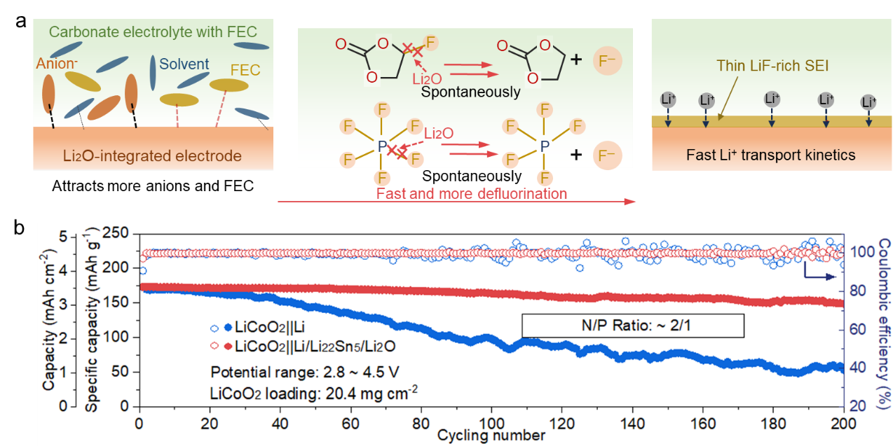 10月8日,长江大学化学与环境工程学院肖围教授课题组在高性能锂金属电池领域取得重要研究进展,其成果"Li2O-Integrated Electrodes Enabling Enhanced Adsorption/Defluorination Kinetics toward LiF-Rich Interphase for High-Performance Lithium Metal Batteries"发表于国际顶级学术期刊Advanced Functional Materials。该研究创新性地通过电极设计,集成对碳酸酯电解液中含氟组分吸附/去氟化能力强的纳米氧化物,在金属锂电极表面原位构筑了化学/电化学稳定的含氟保护层,改善了锂金属负极的电化学性能。李国成博士为论文第一作者,肖围教授为论文第一通讯作者,长江大学为论文通讯第一单位。 内容简述: 锂金属负极因其极低的氧化还原电位和极高的理论比容量,被视为下一代高能量密度电池的理想选择。然而,其实际应用受限于较差的循环稳定性,主要归因于与碳酸酯电解液的高反应性。这种反应导致形成不稳定的固体电解质界面(SEI),在循环过程中易破裂,持续消耗活性锂和电解液。同时,天然SEI在组成、形貌和离子导率上的不均匀性会引发锂离子通量分布不均和成核位点杂乱,进而导致枝晶生长和电池短路。构建稳定均一的SEI层成为抑制副反应和枝晶问题的关键。研究发现,富含LiF等无机成分的SEI可有效提升界面稳定性。现有策略(如高浓度电解液、添加剂和表面修饰)主要通过调控电解液组成或界面化学来促进含氟物种分解生成LiF,但往往依赖复杂配方或精密工艺。相比之下,从电极设计入手,开发能高效吸附并促进含氟组分去氟化的新方法,为构建稳定富LiF界面提供了更具潜力的替代路径。 本研究提出了一种通过调控复合电极对含氟电解质组分的吸附与去氟化动力学,以定向构筑富LiF界面的新策略。采用机械化学方法,在Li/Li22Sn5复合电极中实现了Li2O纳米颗粒的原位、均匀嵌入。研究表明,Li2O对PF6⁻和氟代碳酸亚乙酯(FEC)具有强吸附能力,可加速其自发去氟化过程,进而引导形成以阴离子/FEC衍生物为主的富LiF 固体电解质界面。结合光谱学表征与理论计算,证实了Li22Sn5表面对含氟物种具有优先吸附与去氟化促进作用具有优先吸附与去氟化促进作用,揭示了该界面结构的形成机制。同时,稳定的Li22Sn5合金骨架有助于引导均匀锂沉积并缓冲体积变化,与Li2O协同增强电极稳定性。该复合负极在碳酸酯电解液中实现50次循环内平均库仑效率99.0%。与LiCoO2正极组装的完整电池在苛刻条件(N/P = 2:1,贫电解液20 μL)下表现出优异的循环稳定性,面容量为3.3 mAh cm⁻2,200周后容量保持率达87.0%;180 mAh软包电池在100次循环后仍保持78.2%的容量,充分证明了该电极设计策略的实际应用潜力。 该研究工作得到了国家自然科学基金(52272207和52274292)、北京自然科学基金(2192029)、湖北省杰出青年基金(2020CFA090)等项目的支持。 图文摘要: 图(a)Li/Li22Sn5/Li2O电极吸附/去氟化构筑富含LiF固态电解质界面层示意图;(b)LiCoO2||Li/Li22Sn5/Li2O、LiCoO2||Li电池循环性能对比图。 文章链接:https://advanced.onlinelibrary.wiley.com/doi/epdf/10.1002/adfm.202523194 (审核:肖围 编辑:常艳玲)